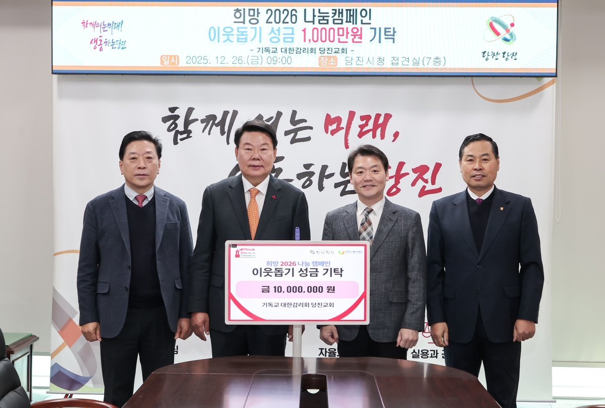 [충청중심뉴스] 당진시는 12월 26일 오전, 기독교대한감리회 당진교회가 당진시청을 방문해 ‘희망2026 나눔캠페인’이웃돕기 성금 1천만 원을 기탁했다고 밝혔다.