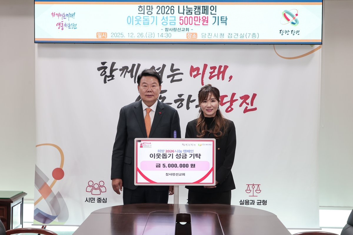 [충청중심뉴스] 당진 참사랑선교회가 26일 오후 당진시청을 방문해 ‘희망2026 나눔캠페인’이웃돕기 성금 500만 원을 기탁하며 지역사회에 따뜻한 온정을 전했다.