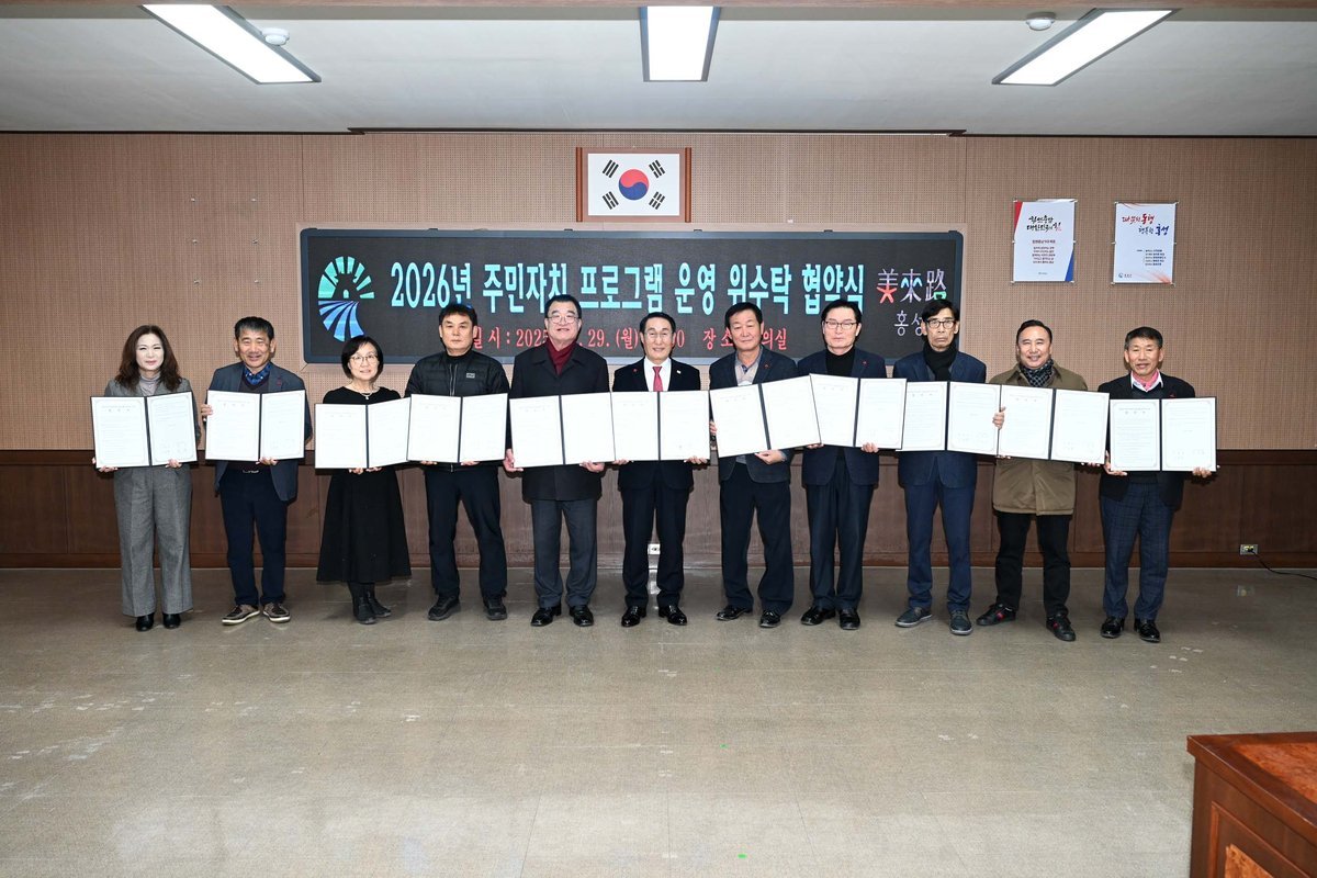 [충청중심뉴스] 홍성군은 지난 29일 군청 회의실에서 김노성 홍성군주민자치협의회장을 비롯한 11개 읍‧면 주민자치회장이 참석한 가운데 ‘2026년 주민자치센터 프로그램 운영 위‧수탁 협약식’을 개최했다.