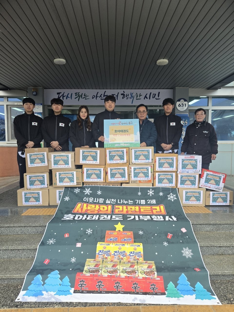 [충청중심뉴스] 국가대표호아태권도장은 지난 29일 신창면 행복키움추진단에 사랑 나눔 라면 1200개를 기탁했다.