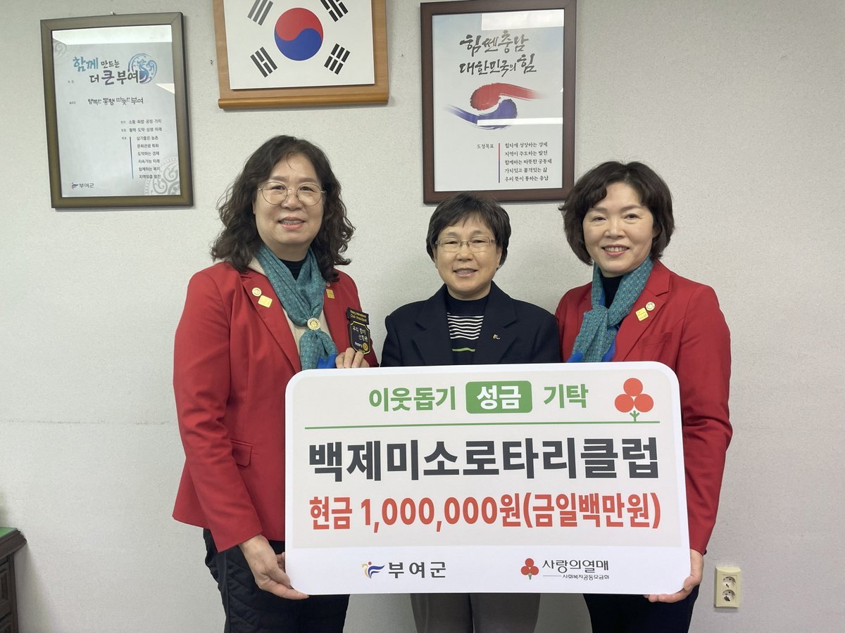 백제미소로타리클럽 김미애 회장은 “회원들의 정성이 담긴 성금이 추운 겨울 어려운 이웃들에게 따뜻한 위로가 되길 바란다.”라며, “앞으로도 성금 기탁은 물론 밑반찬 배달 봉사처럼 우리 주변의 이웃들이 직접 체감할 수 있는 실질적인 봉사활동을 꾸준히 이어가겠다.”라고 전했다.