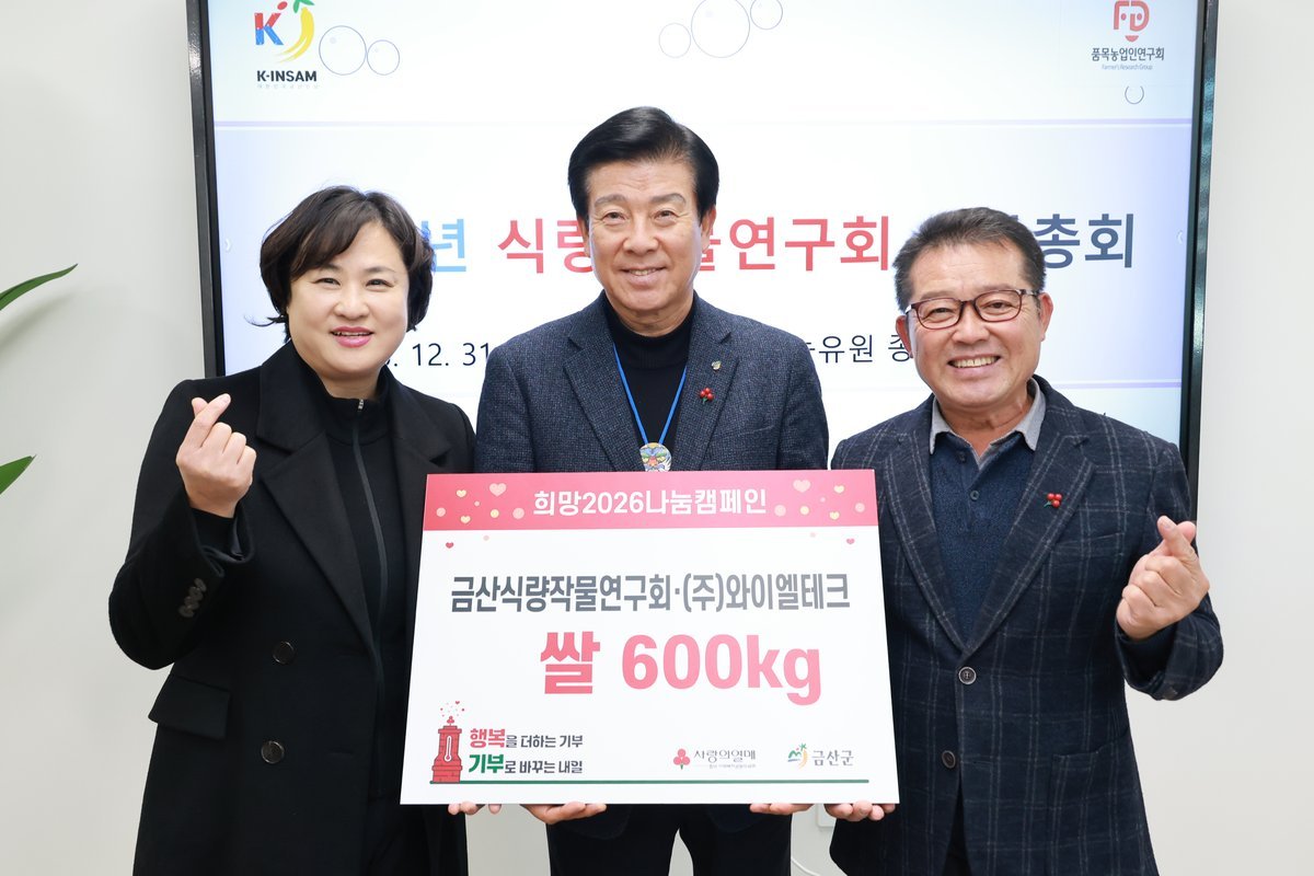 [충청중심뉴스] 금산군식량작물연구회는 2025년 12월 31일 농업기술센터 농유원 종합상황실에서 회원 등 40여 명이 참석한 가운데 연말총회를 개최하고 쌀 600kg을 기탁했다.