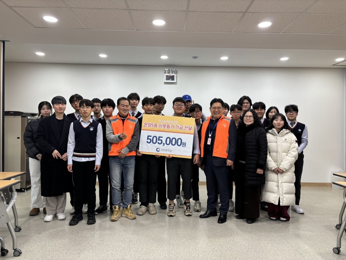 [충청중심뉴스] 아산시 온양중학교는 지난 5일, 학교 축제 수익금으로 마련한 후원금 50만 5천 원을 온양5동 행복키움추진단에 전달하며 지역사회 나눔을 실천했다.