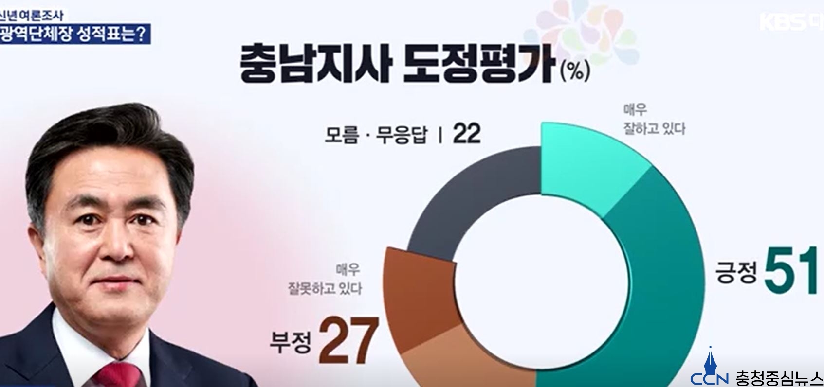 김태흠 충남도지사는 부정평가를 큰 차이로 누르며, 51%의 평가를 받아 충청권 광역 단체장 중에서는 가장 좋은 평가를 받음으로서 그 능력을 인정 받았다.