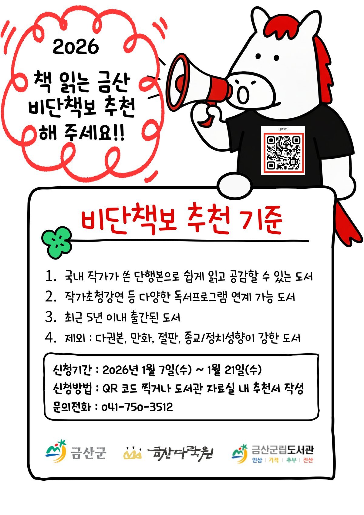 추천 접수는 7일부터 오는 21일까지 진행되며 금산군립도서관 누리집 또는 도서관 자료실에서 신청할 수 있다.
