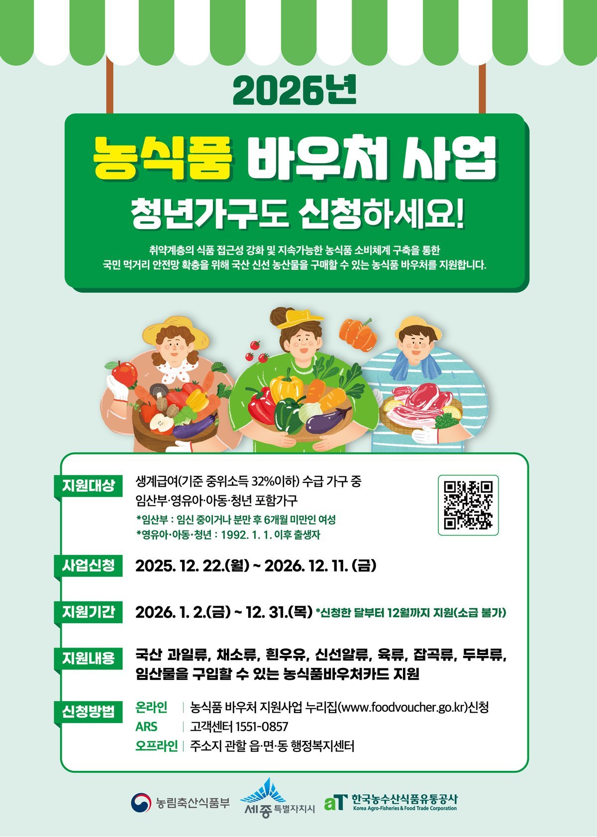 바우처 신청은 오는 31일까지 농식품 바우처 누리집, 자동응답전화, 신분증 지참 후 주소지 행정복지센터 방문 등으로 하면 된다.