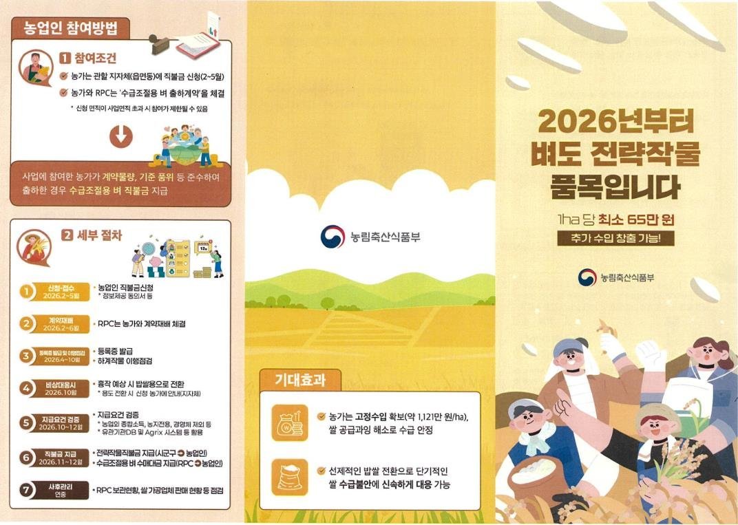 [충청중심뉴스] 홍성군은 국립농산물품질관리원 충남지원 홍성사무소에서 쌀 공급 과잉 문제를 해소하고 농가 소득을 안정적으로 지원하기 위해 2026년부터 수급조절용 벼 를 전략작물직불제 품목으로 새롭게 추가한다고 밝혔다.